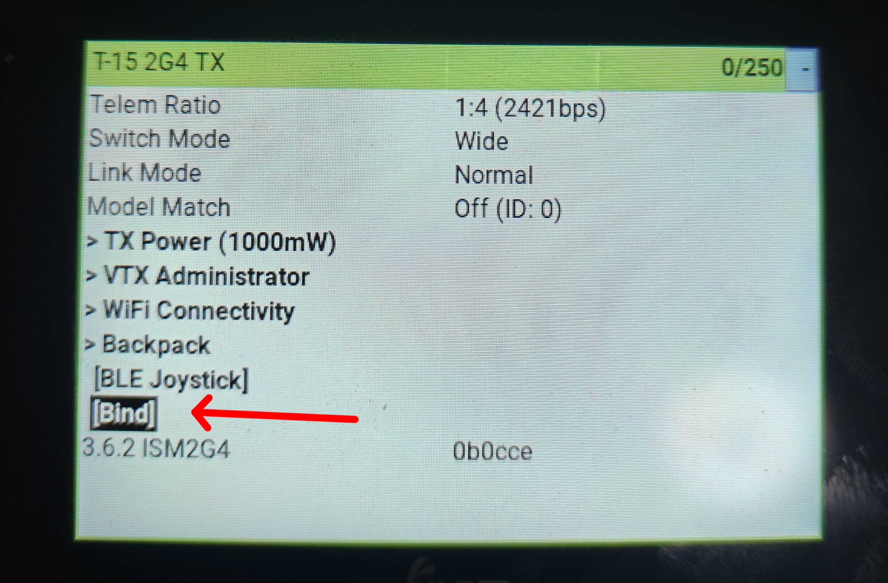 在ELRS设置中找到“绑定(Bind)”选项,点击进入,此时遥控将进入对频模式,通常会有相应的提示信息或LED灯指示。
