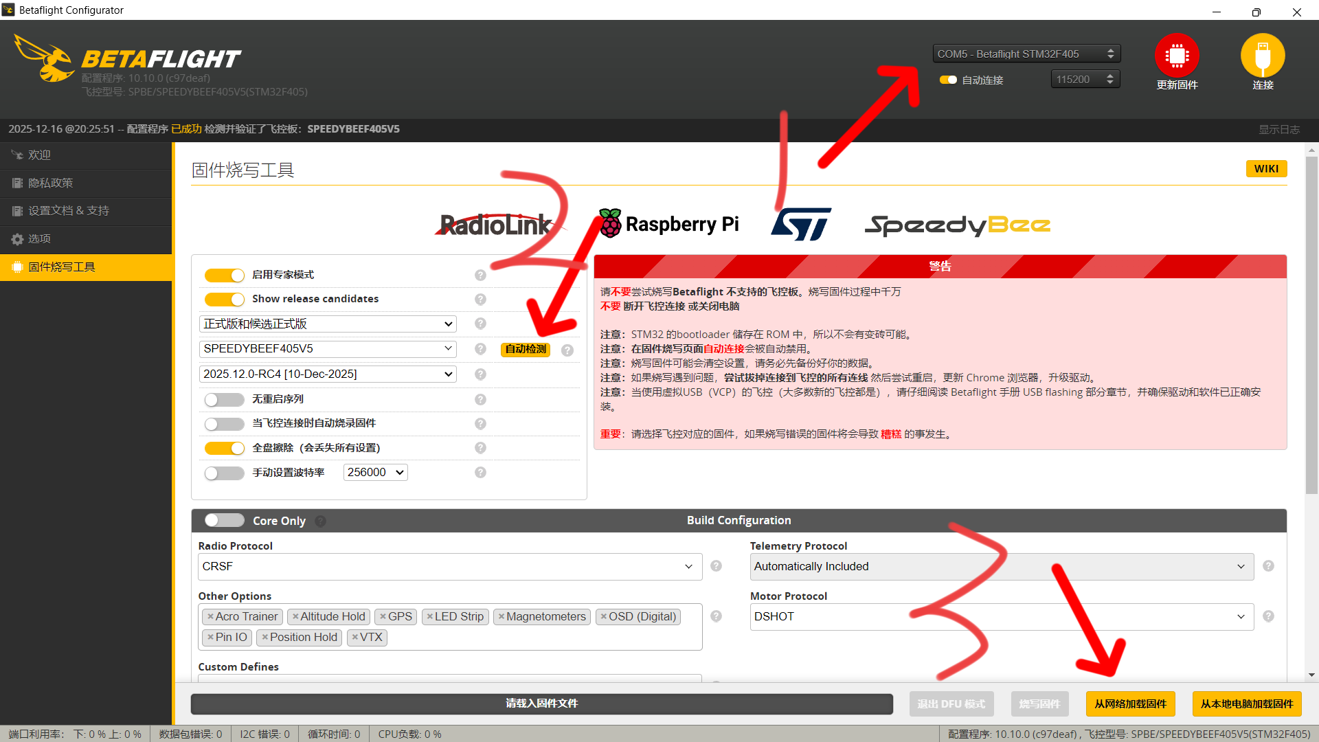 Betaflight 4.4及以上版本采用云端构建(Cloud Build)技术,刷写固件时需先选择所需功能,否则后续无法启用。这份教程从准备工作到实操步骤,手把手教你完成固件刷写,新手也能轻松上手。