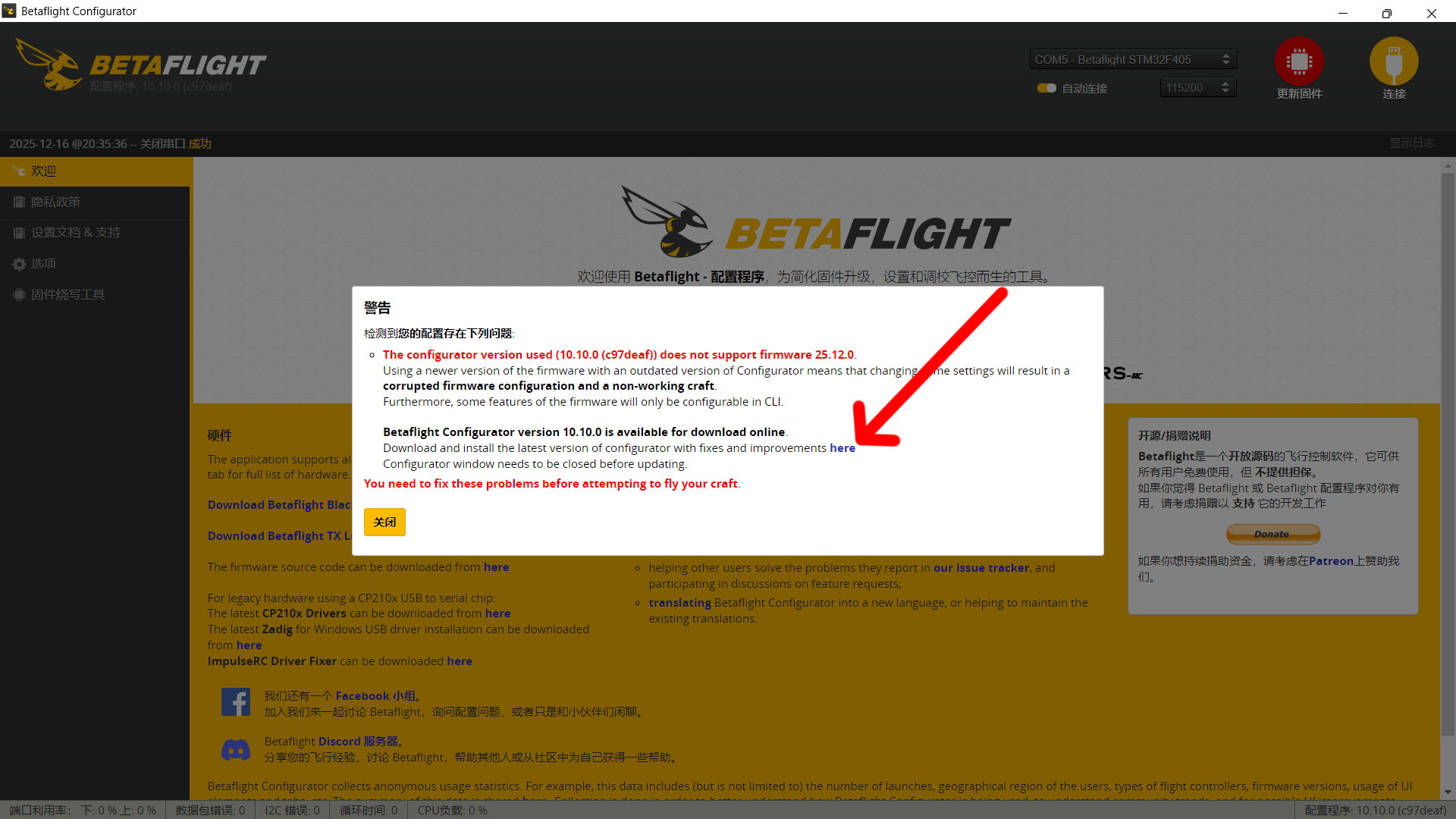 2. 首次刷写后,需重新配置接收器、PID参数、摇杆校准等基础项,确保飞控正常工作。
