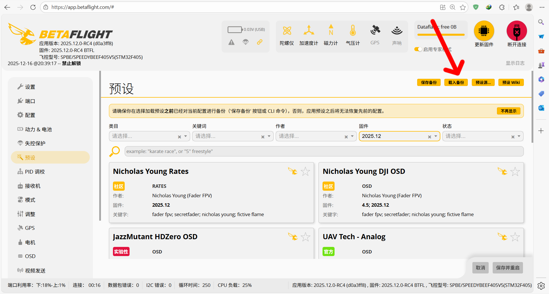 1. 若之前备份了参数,可在预设选项卡中导入备份文件,恢复原有调参设置。